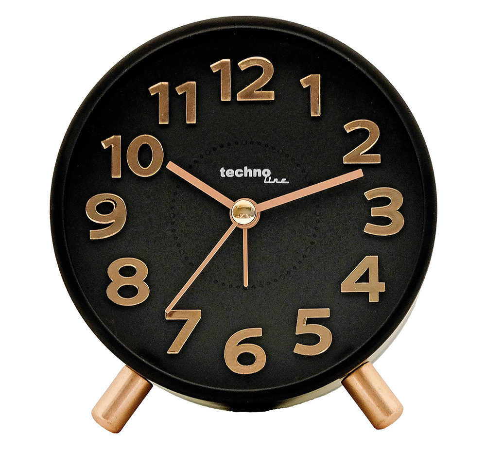 Technoline bord/vækkeur model F – i en flot sort model med sort baggrund og med gyldne visere og ben.